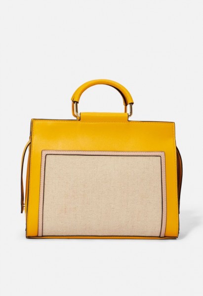 Material: Linen/Faux Leather Size: 12”L x 10”H x 5.5”D Hardware color: Gold Handle drop measurement : 3" Removable Adjustable Shoulder Strap Pockets: 1 interior pocket, 1 interior zip Closure: Zipper